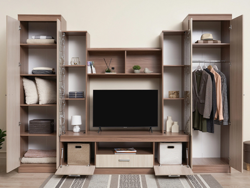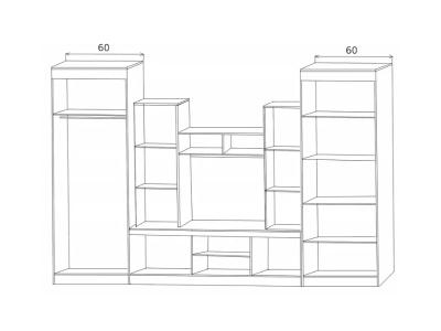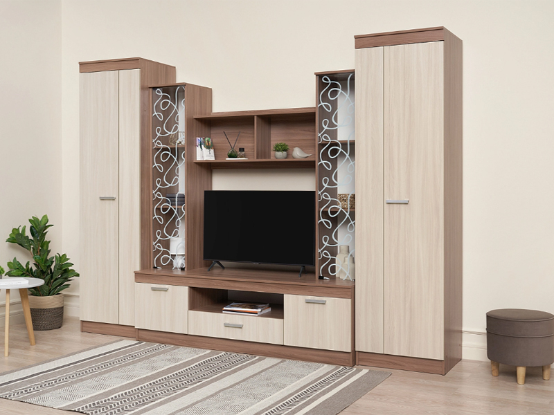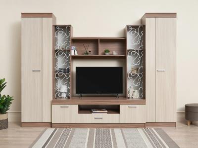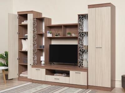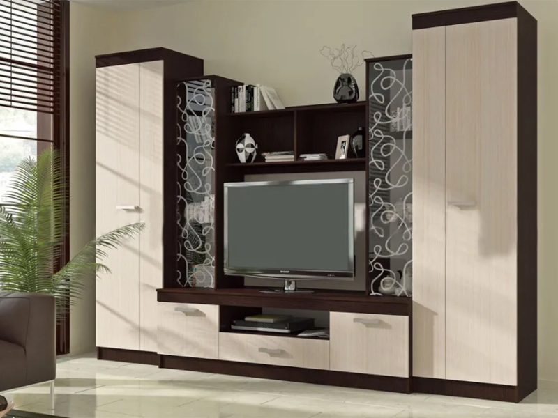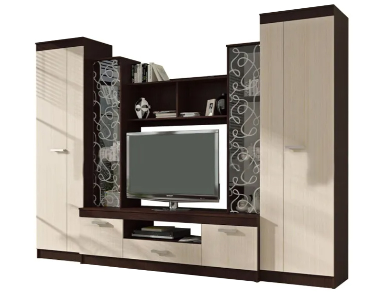 Красивая гостиная для стильного интерьера и практичного выбора. Настоящее украшение модели – центральные шкафы-витрины с нанесенным на стекло фантазийным рисунком.
