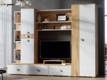 - Гостиная включает себя платяной шкаф, нишу под ТВ и пенал с полками