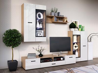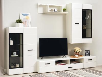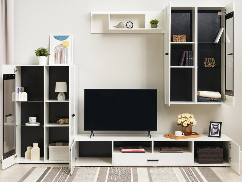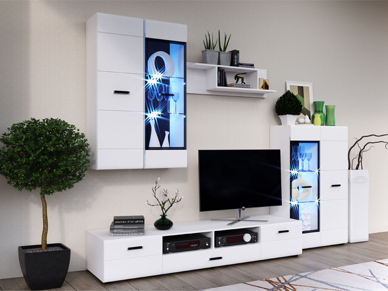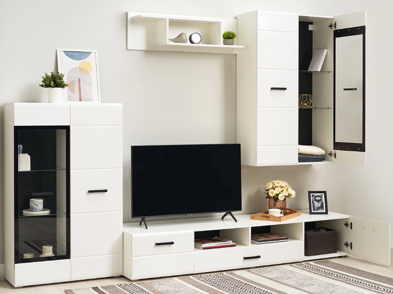 Изысканная, белоснежная с приятным блеском гостиная, несомненно украсит собой любую квартиру или дом. В гостиной есть все необходимые элементы для красивого оформления комнаты. Фасады с фрезеровкой и стеклянные витрины создают современный и стильный образ вашему дому.