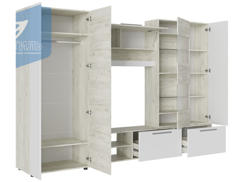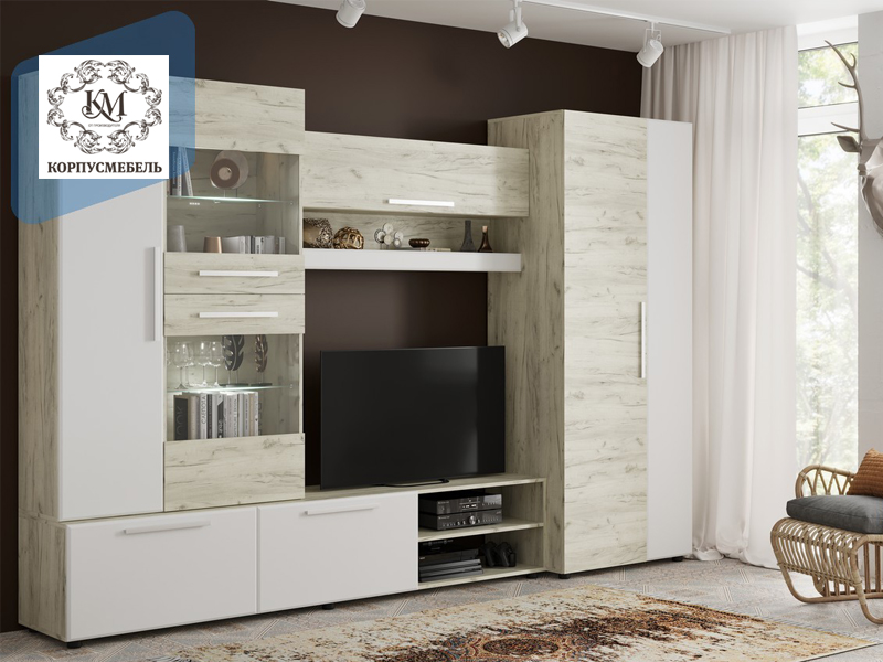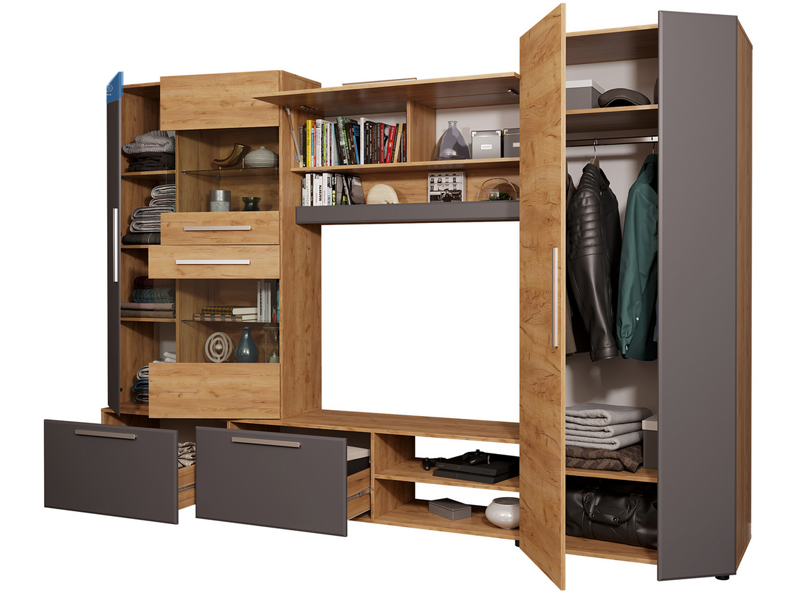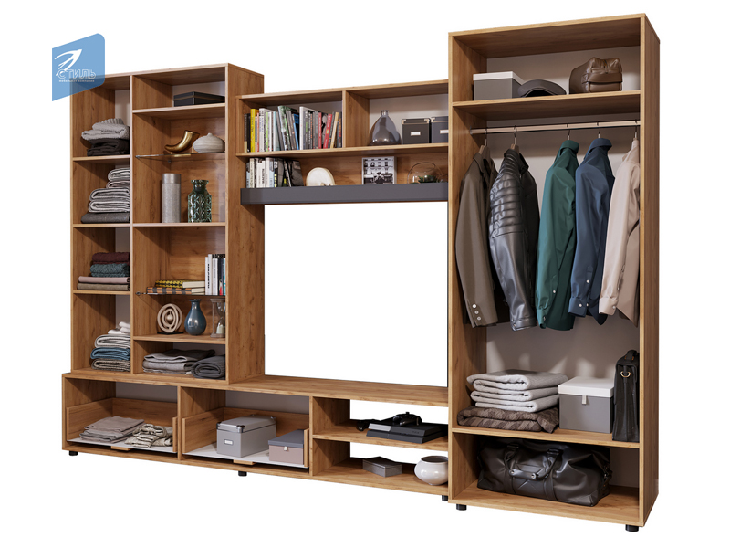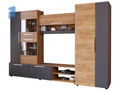 «САФАРИ НМ Стенка» выполнена в современном выдержанном европейском стиле. Стенка предназначена для оборудования гостиных жилых домов и квартир. Отличительными особенностями модели являются наличие вместительных модулей (шкафа, надстройки, антресоли, тумбы под ТV) и элегантный дизайн, сочетающий изысканность цвета и фактур корпуса и фасадов яркого «Дуб Крафт золотой» и мягкого «Графит СОФТ».