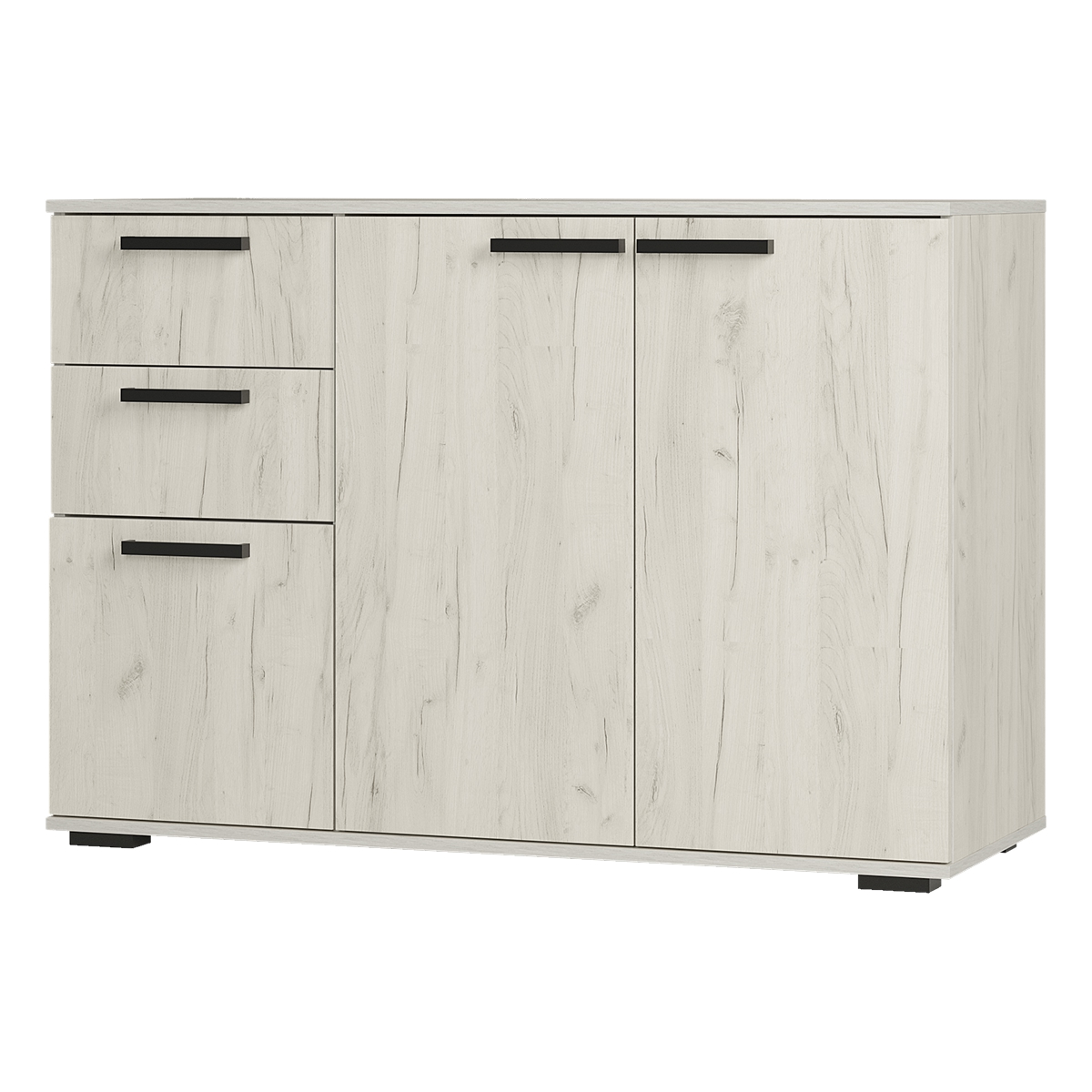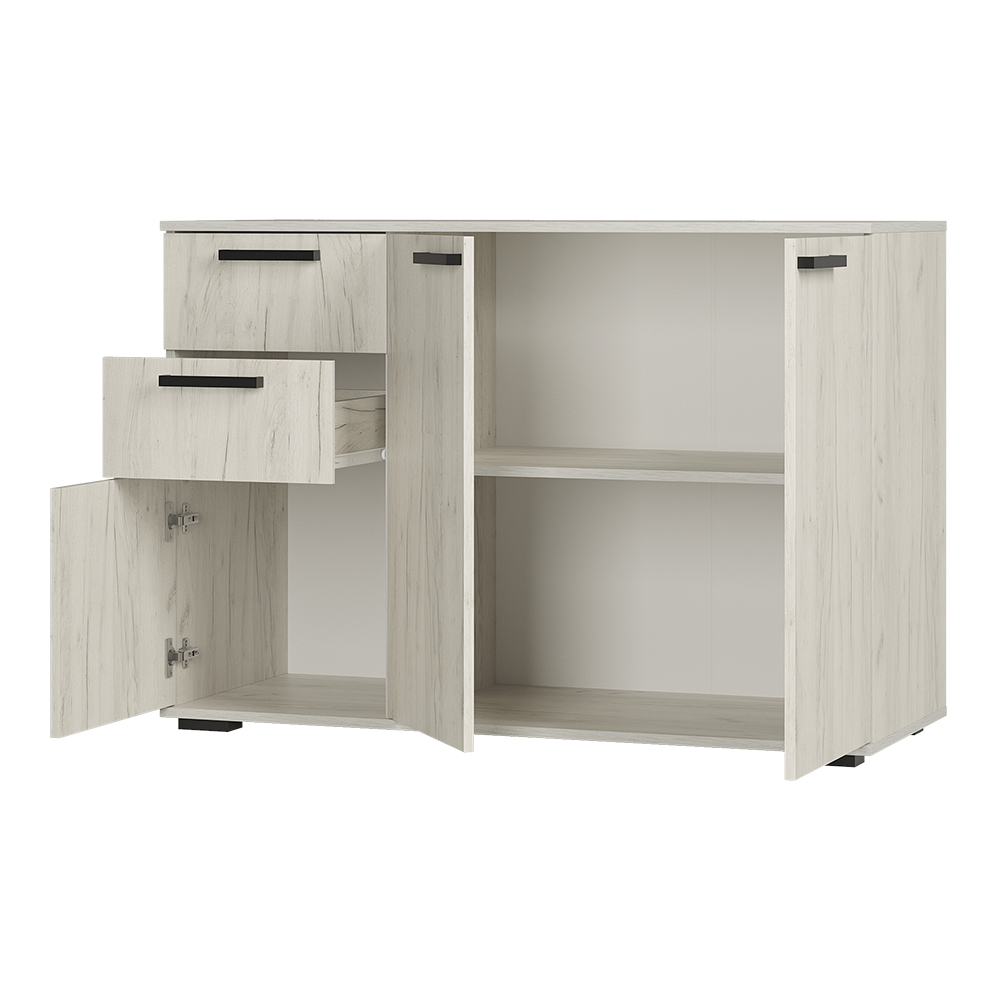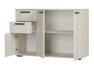 Комод «Стандарт № 3» имеет необычное размещение полок и ящиков. Основная часть изделия состоит из двух распашных дверок, за которыми находятся места для хранения вещей. Левая часть комода представляет собой два выдвижных ящика и нижнюю секцию также с распашной дверцей и полками.