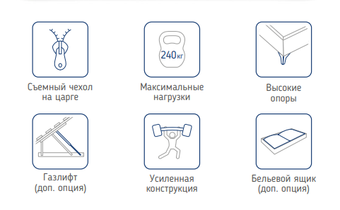Съемный чехол на царге и изголовье облегчает уход за кроватью. Возможность замены чехла на другое цветовое решение. Крепление царги и спинки каркаса стыкуется на соединительных уголках, металлическая траверса на болтах. Такой способ соединения элементов кровати дает возможность многократной сборки-разборки.