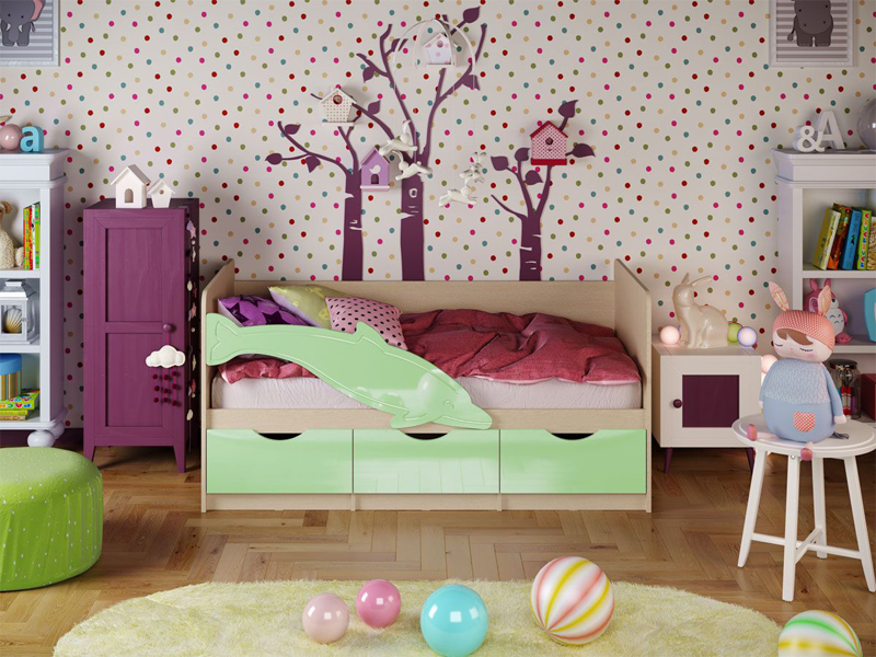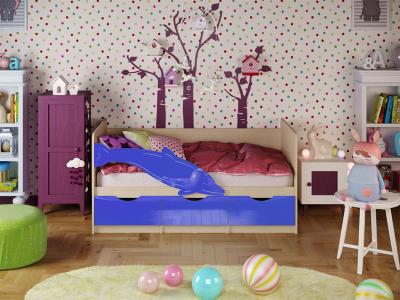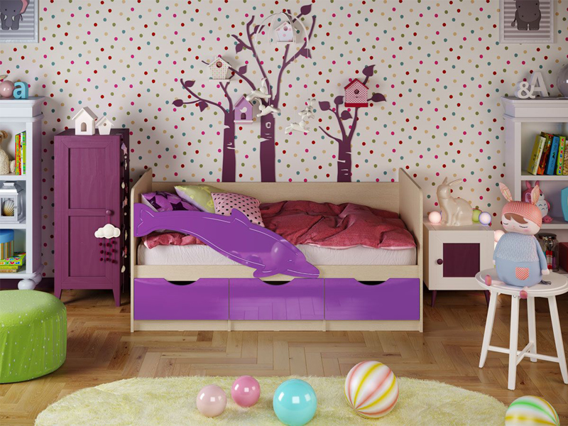 Удобная, прочная и устойчивая кровать с выдвижными ящиками. Передний ограничительный бортик выполнен в виде дельфина. Для маленьких детей и подростков.
