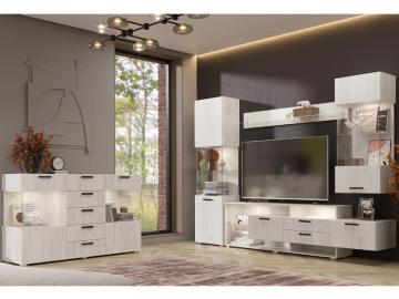 Модульная гостиная «Флоренция» — многофункциональная грациозная гостиная украшена гнутыми стёклами с пескоструйной обработкой и стразами Swarowki. Центральная секция рассчитана на большой ТВ диагональю 45-47 дюймов.