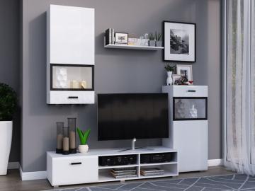 В данной стенке есть все. что необходимо в современной гостиной - тумба под ТВ, витрина, полки, двухдверный шкаф и пенал для различных вещей.
