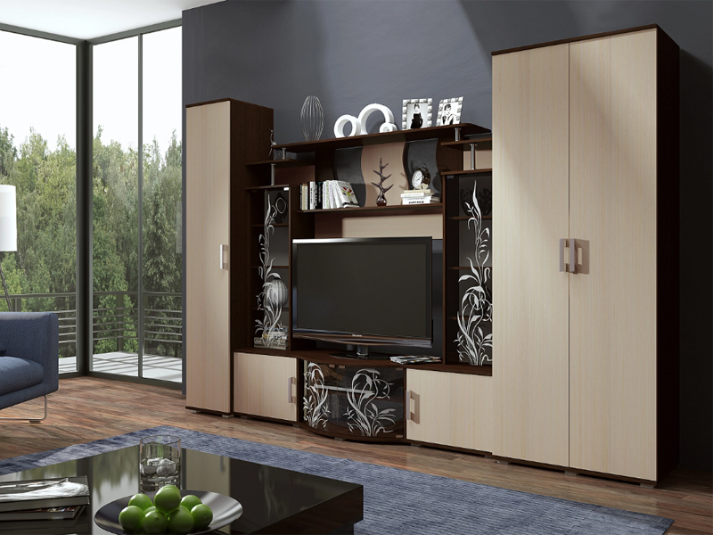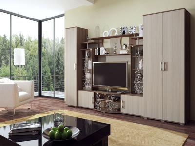 Стенка Виста - компактная мебель для гостиной комнаты. Мебель изготовлена из влагостойкого ЛДСП. В данной стенке есть все. что необходимо в современной гостиной - тумба под ТВ, витрина, полки, двухдверный шкаф и пенал для различных вещей. На стеклах витрин - изящный рисунок. Стенку можно приобрести без шкафа и пенала, так же с одним из этих предметов. Шкаф и пенал так же можно приобрести по отдельности.