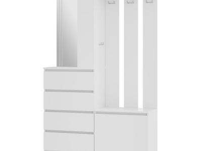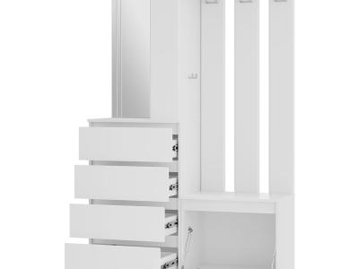 Прихожая «Симпл» (ПР-04) — конструкция продумана до мелочей. Комплект оснащен всем необходимым для комфортного размещения вещей в прихожей. Впишется как в просторное, так и в небольшое помещение. Под зеркалом в минималистичном дизайне — четыре выдвижных ящика, в которых можно хранить шарфы, шапки и другие нужные аксессуары. Еще одна нижняя полка подойдет для хранения сезонной обуви, а три открытых полки рядом с зеркалом — для ключей. Несколько крепких крючков для верхней одежды. Нижняя откидная створка - на кронштейнах.