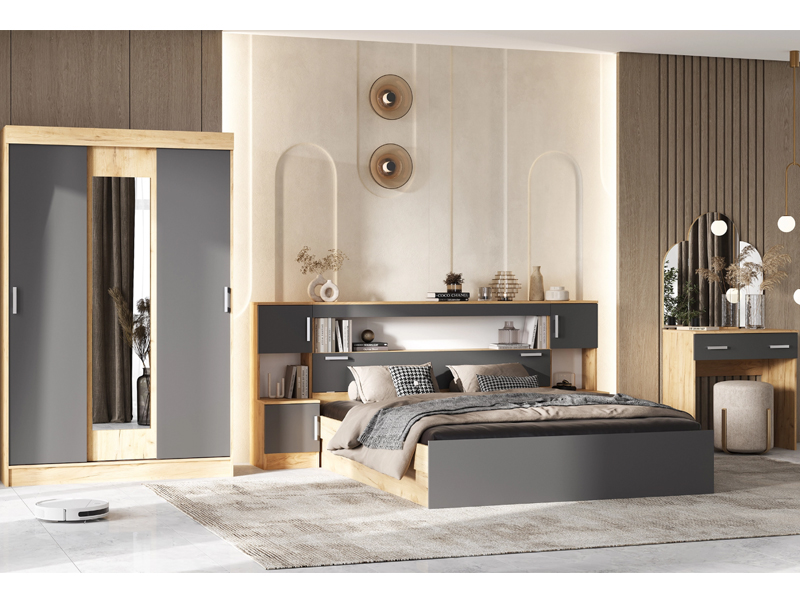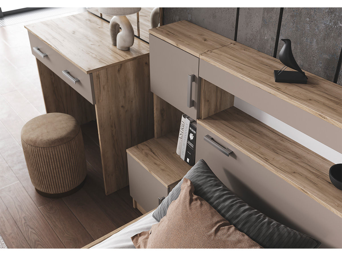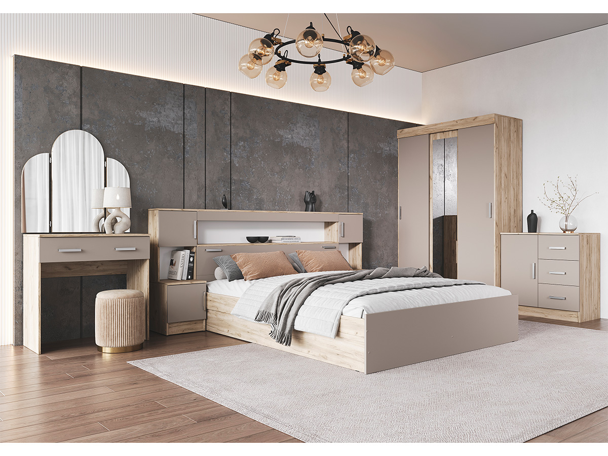 В самом названии этой спальни видится что-то мягкое, удобное и уютное. Интересное и функциональное дизайнерское решение – кровать с надстройкой – служит дополнительным местом для хранения вещей.