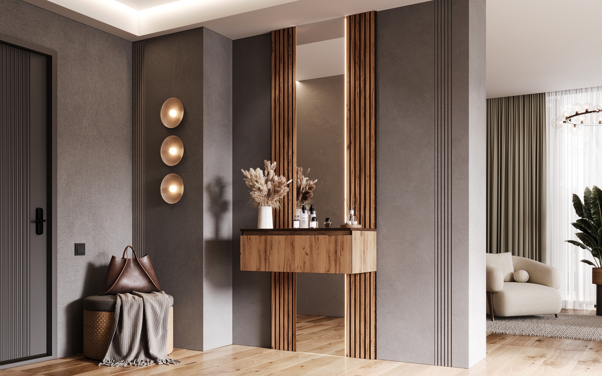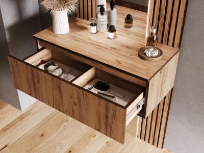 Подвесная косметическая тумба, выполненная в цвете Дуб крафт,со скрытой подсветкой и вместительным ящиком. Парящая конструкция, премиальный минимализм и идеальный порядок в каждой детали. Для спальни,гардероба и зоны ухода