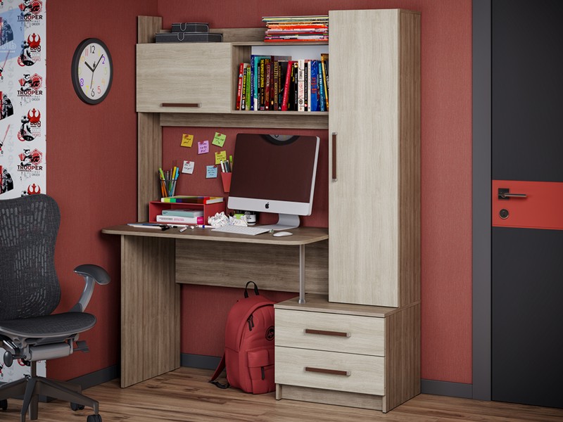 Размер под монитор – 1083 х 556 мм. Уголок состоит из рабочего стола размером Д.1100 х В.760 х Г.586 мм., закрытого пенала размером Д.350 х В.1356 х Г.285 мм. , в котором удобно хранить документы и книги. Есть тумба размером Д.548 х В.442 х Г.480 мм. с двумя выдвижными ящиками на роликовых направляющих, благодаря чему процесс открывания ящиков будет проходить без лишних усилий. Дополнительным местом для хранения мелочей является верхняя закрытая полка, а рядом с ней на открытой полке можно расположить выставку достижений школьника. Во избежание нанесения травм, углы стола имеют скруглённые формы, поэтому он безопасен не только для подростков но и юным пользователям. Данная модель имеет возможность собираться как на левую, так и на правую сторону.