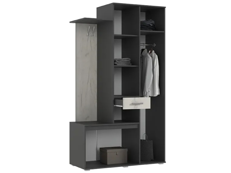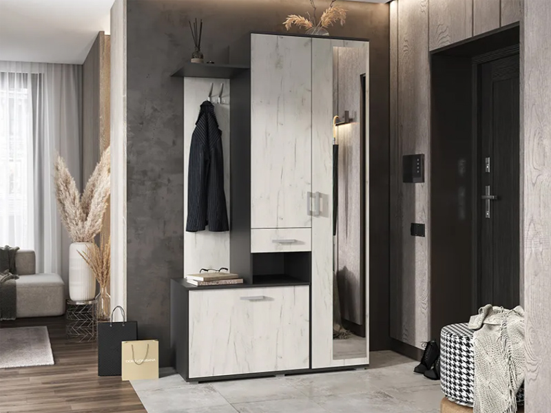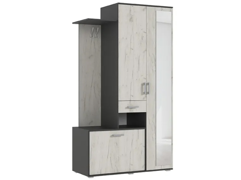 Прихожая «Лира» при своих компактных размерах и невысокой цене оснащена всем необходимым: два крючка для сезонной одежды, тумба для обуви, вместительное отделение для верхней одежды с большим зеркалом, открытые и закрытые полочки для разных необходимых (и не очень) мелочей!