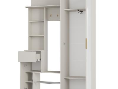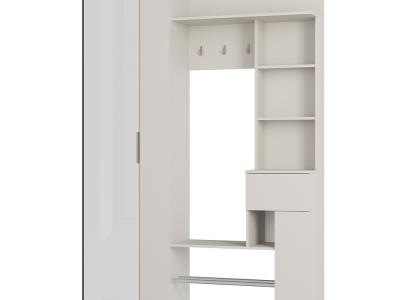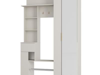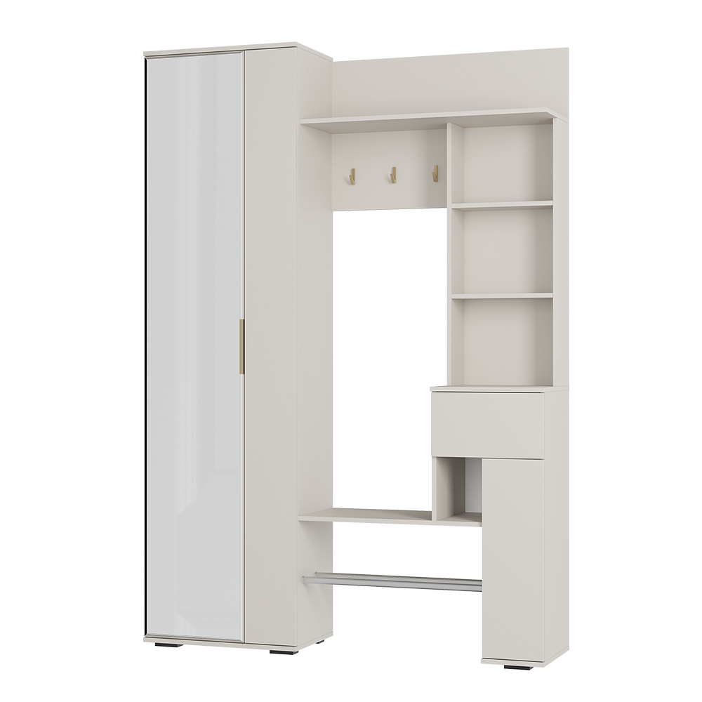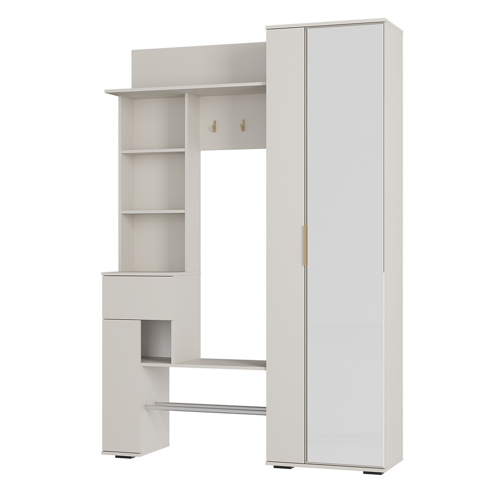 Прихожая "Ницца" выполнена в трендовом оттенке "кашемир". Модель включает в себя: большой шкаф для верхней одежды, полку под сумки и головные уборы, обувницу с металлическими рейками с защитой от промокания, множество полок для мелочей, компактный ящик с шариковыми направляющими полного выдвижения. яркий акцент на фасаде: стильная торцевая ручка и крючки в цвете "матовое золото", удобное зеркало в полный рост добавит пространству света. Толщина кромки - 0,45 мм. Опоры - регулируемые, прямоугольные, черные. Шариковые направляющие 300 мм. Тип обработки зеркала - еврокромка. Ручка - АБС-пластик, матовое золото, 128 мм. Петли накладные. Крючки - матовое золото, АБС-пластик. Крепление к стене - навес плоский. Максимальная нагрузка на ящик - 5 кг, на штангу/полку - 10 кг, на крючок - 3 кг. Универсальная сборка.
