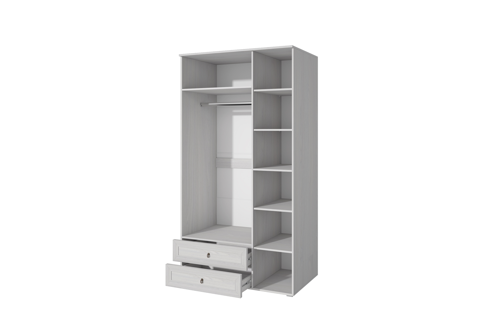- Шкаф сочетает в себе два выдвижных ящика на шариковых направляющих, платяное отделение и полки для хранения вещей.