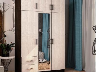 Очень вместительная модель трехстворчатого шкафа с ящиками будет прекрасно смотреться в вашей спальне. Изделие состоит из нескольких зон для хранения одежды и обуви, включая два выдвижных ящика для мелких вещей, отделение для одежды на вешалках и вместительные полки. В центральную створку вставлено зеркало, что помимо основной функции, позволяет визуально расширить пространство. Кромка – 0,45 мм. Опоры – подпятник. Ручки – накладные. Петли створок – 4-х шарнирные, накладные. Максимальная нагрузка на полку – 10 кг, на штангу – 10 кг, на ящик – 5 кг.