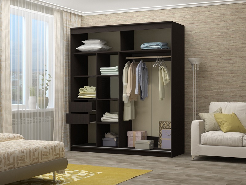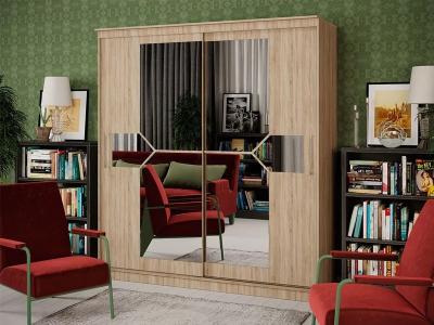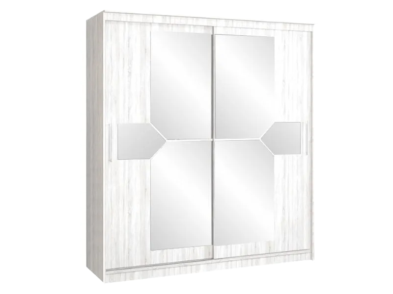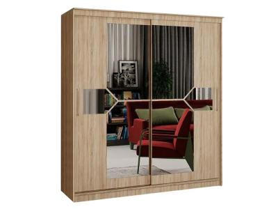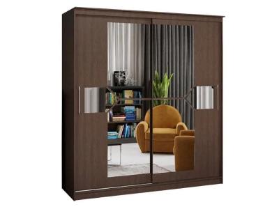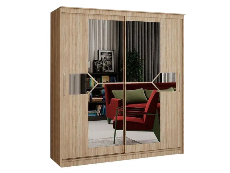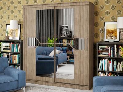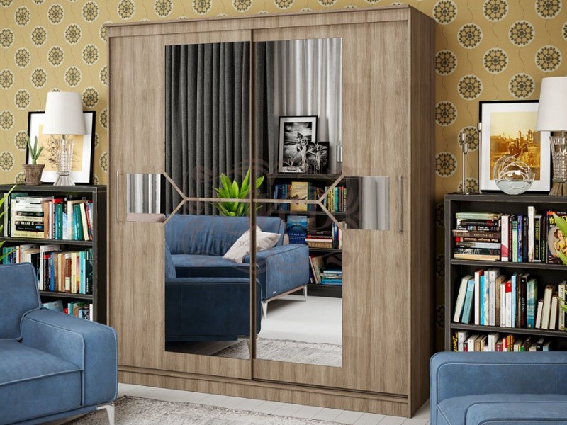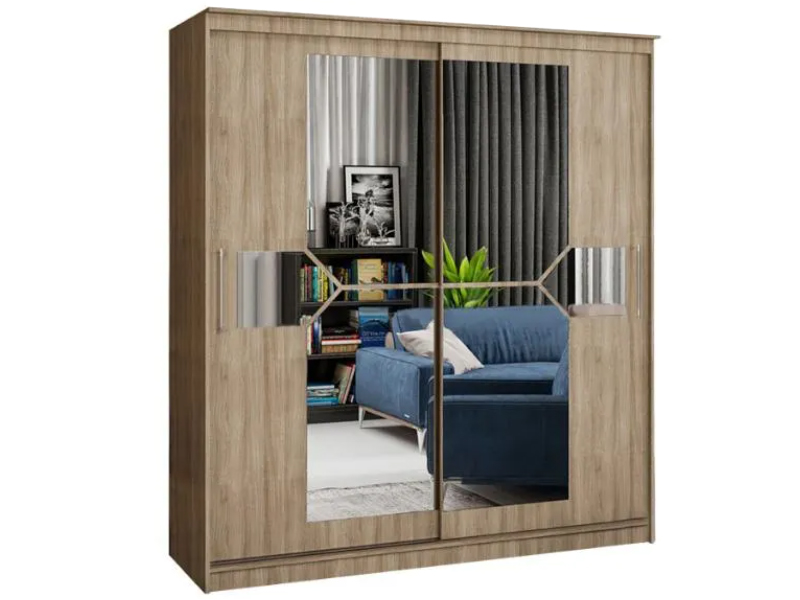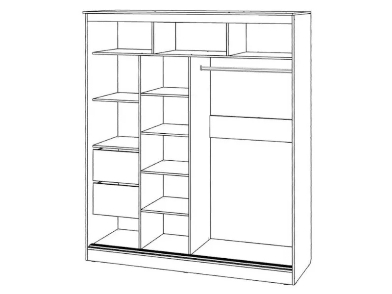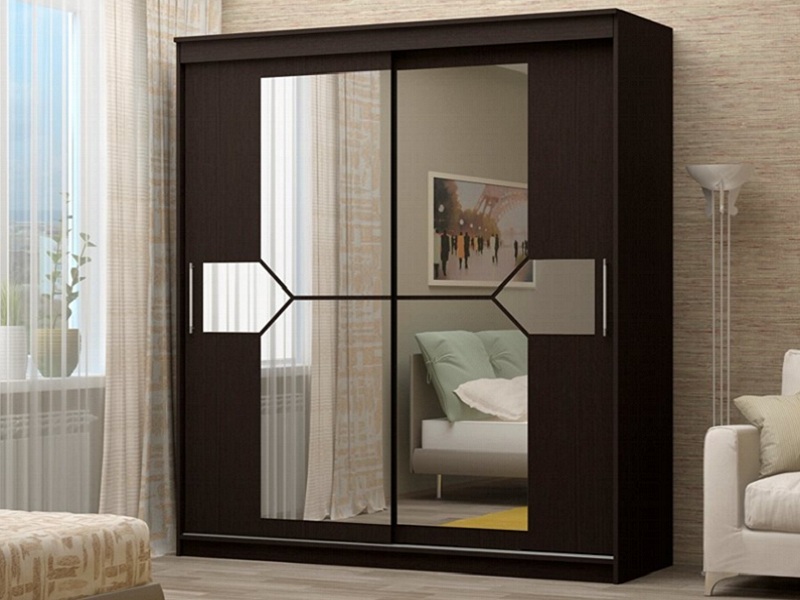 Оригинальный дизайн фасада делает эту модель весьма привлекательной. Зеркала, занимая практически всю площадь раздвижных дверей, скрадывают габариты шкафа, зрительно расширяют помещение.