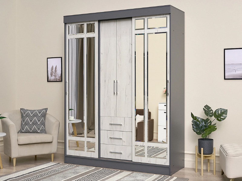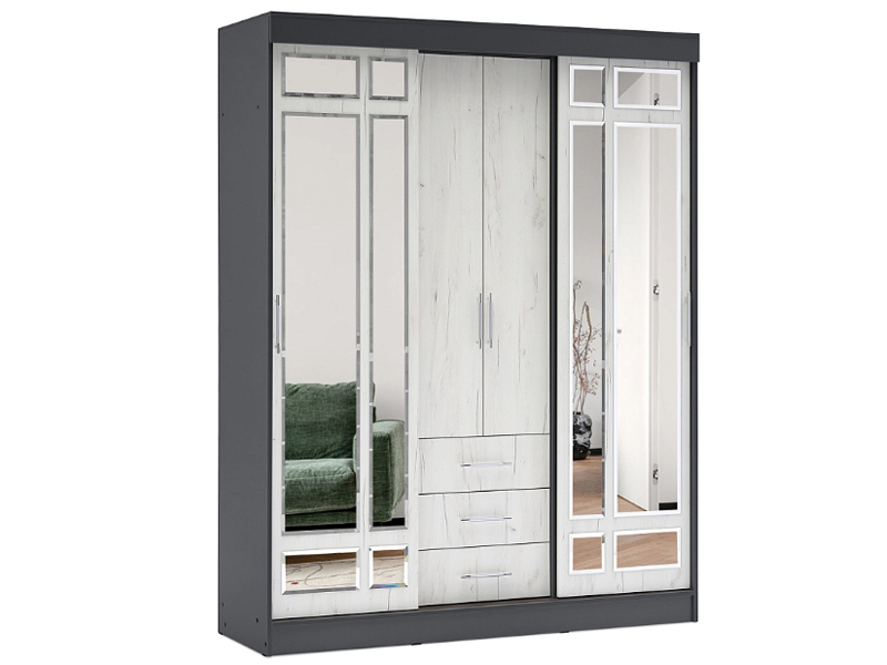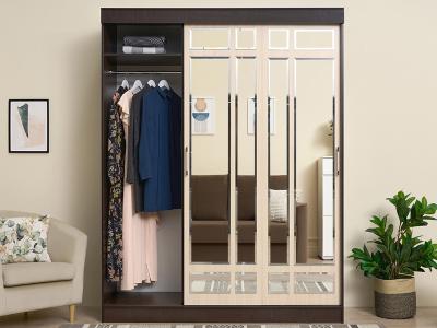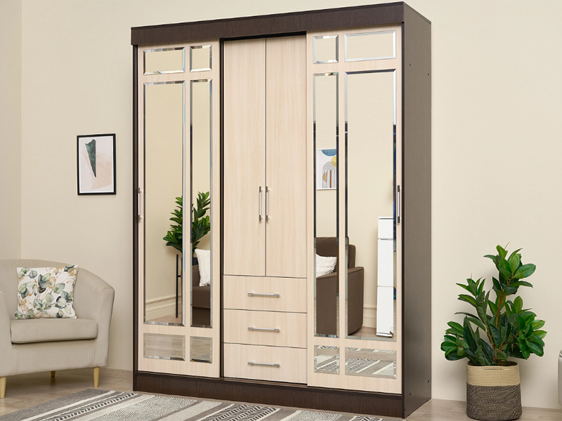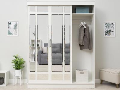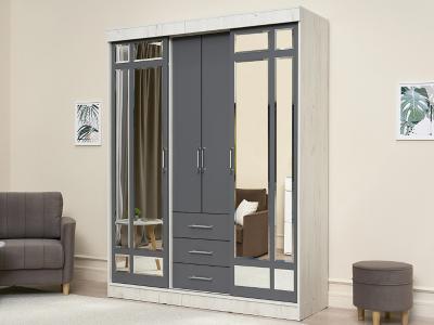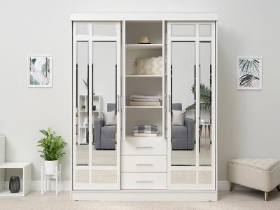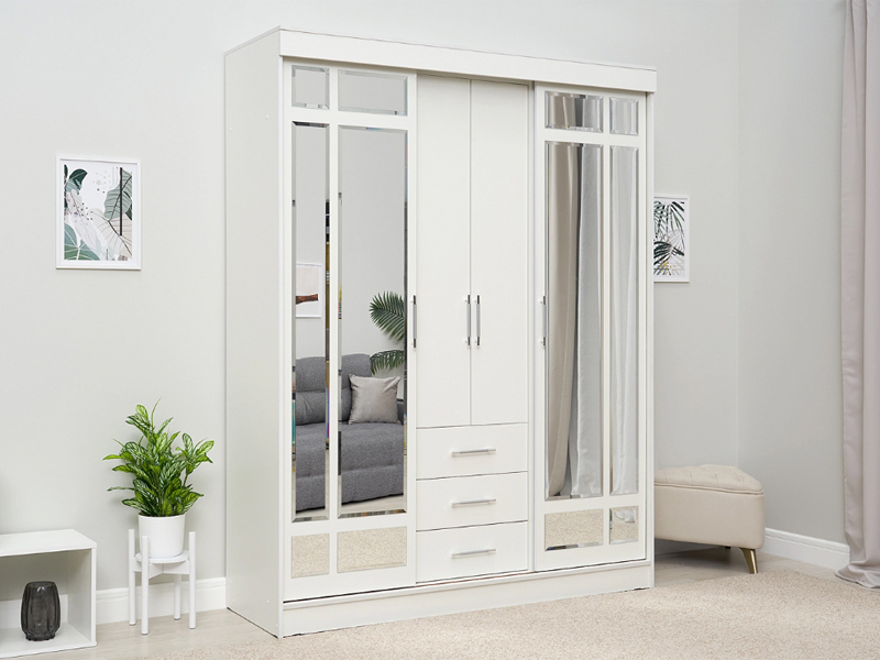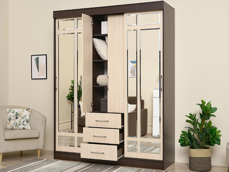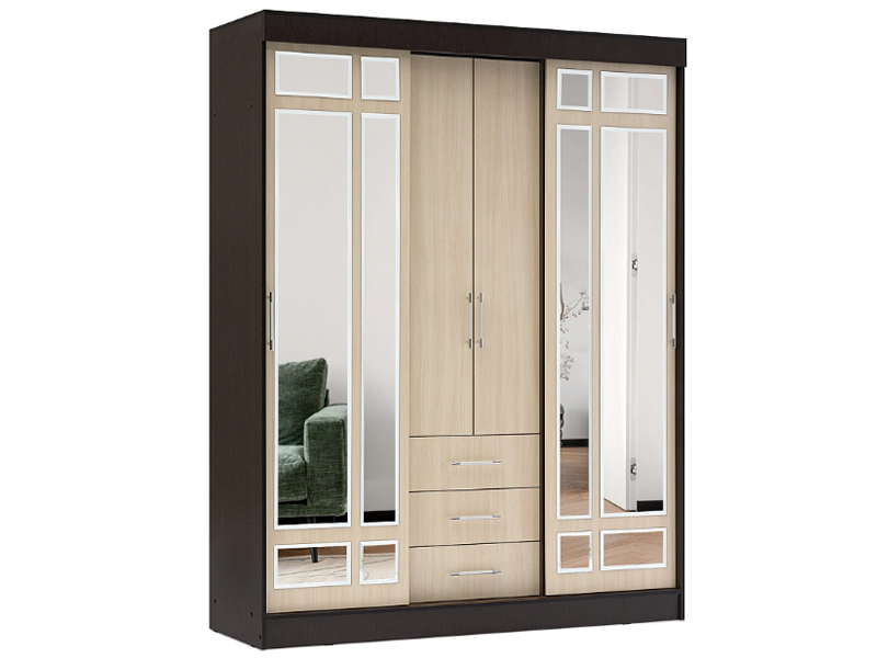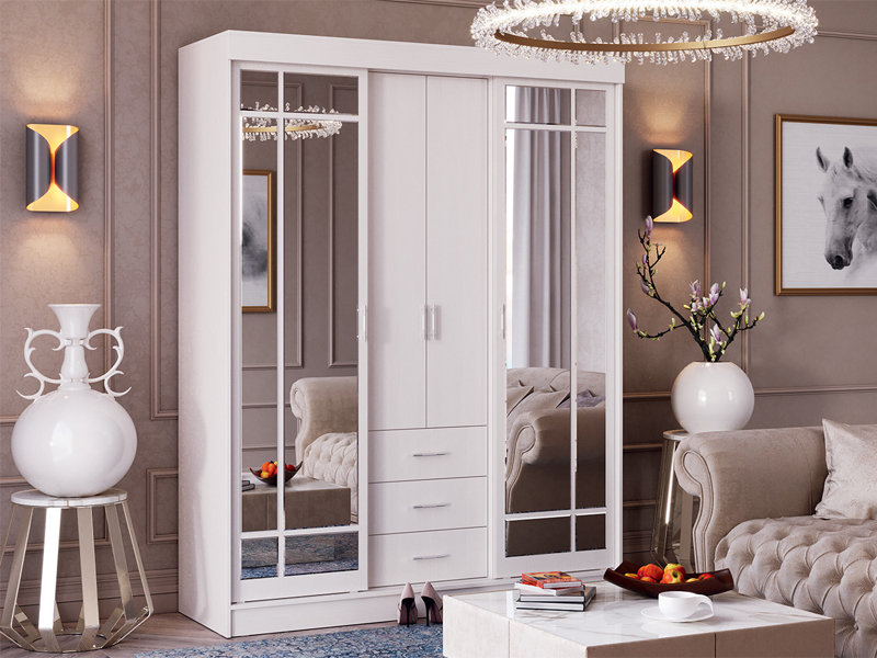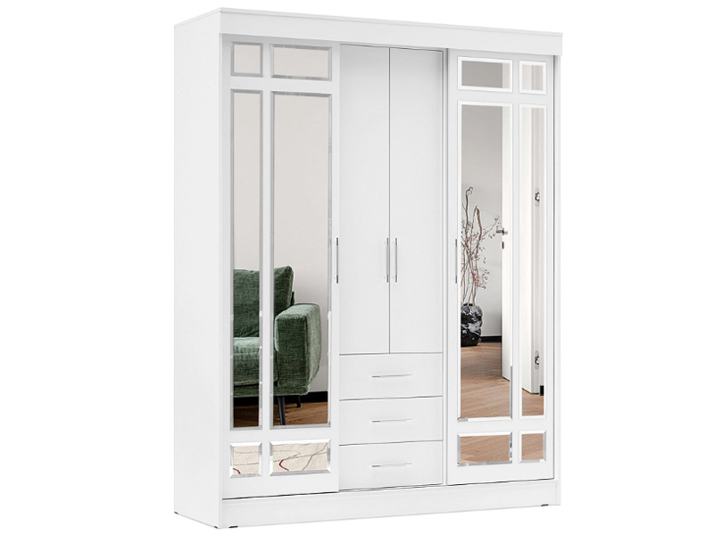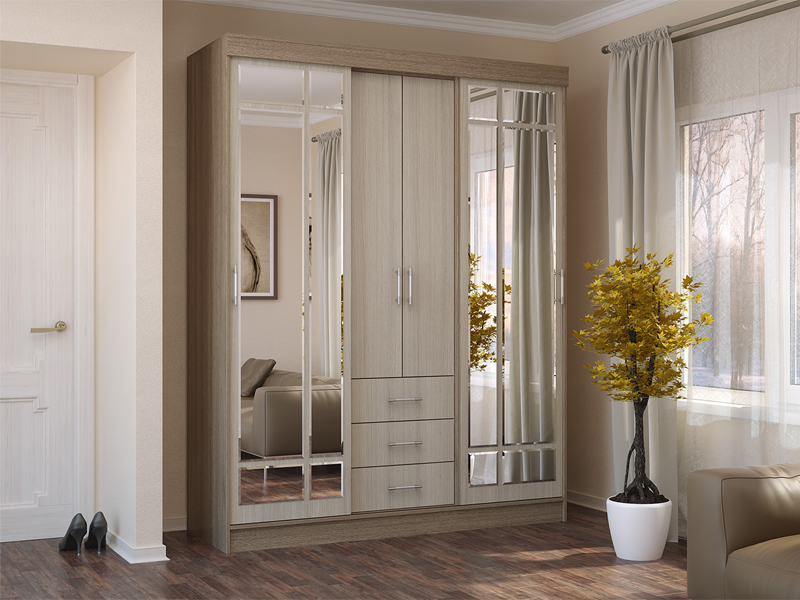 Лаконичный внешний вид и стильный дизайн 4-х дверного шкафа-купе удачно сочетаются с практичностью и надежностью. Боковые зеркала зрительно уменьшают его объемные формы, придают ему некоторую хрупкость и невесомость.