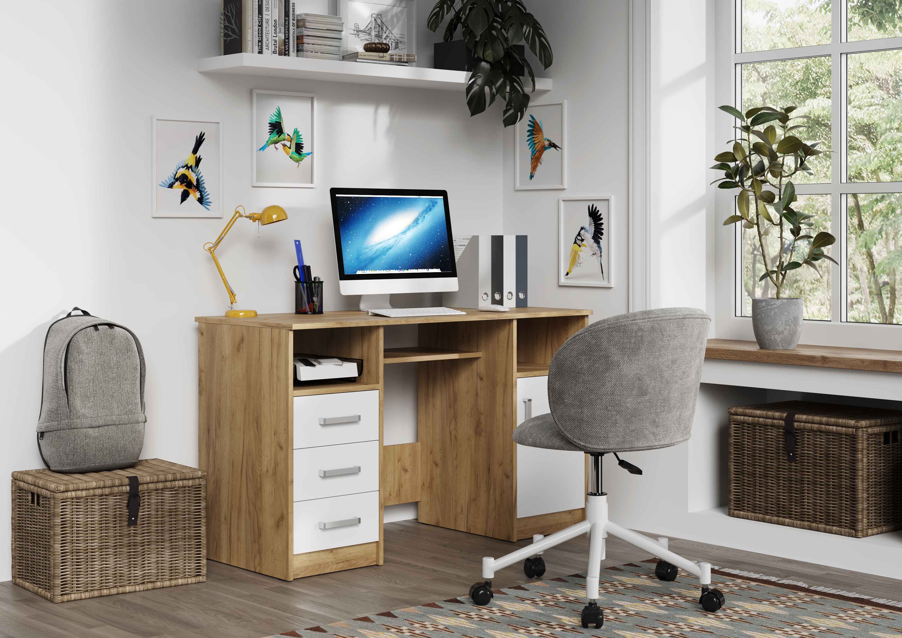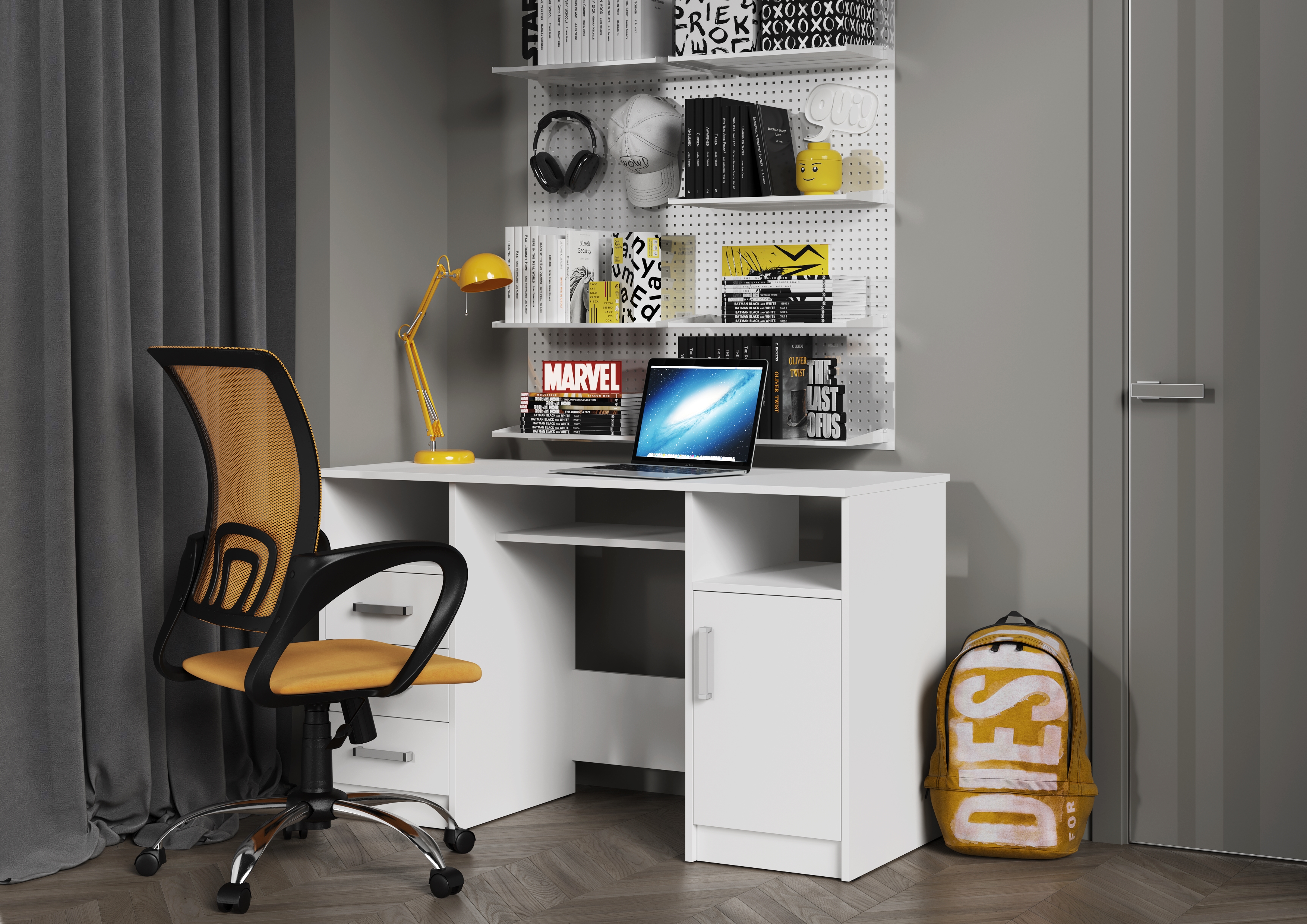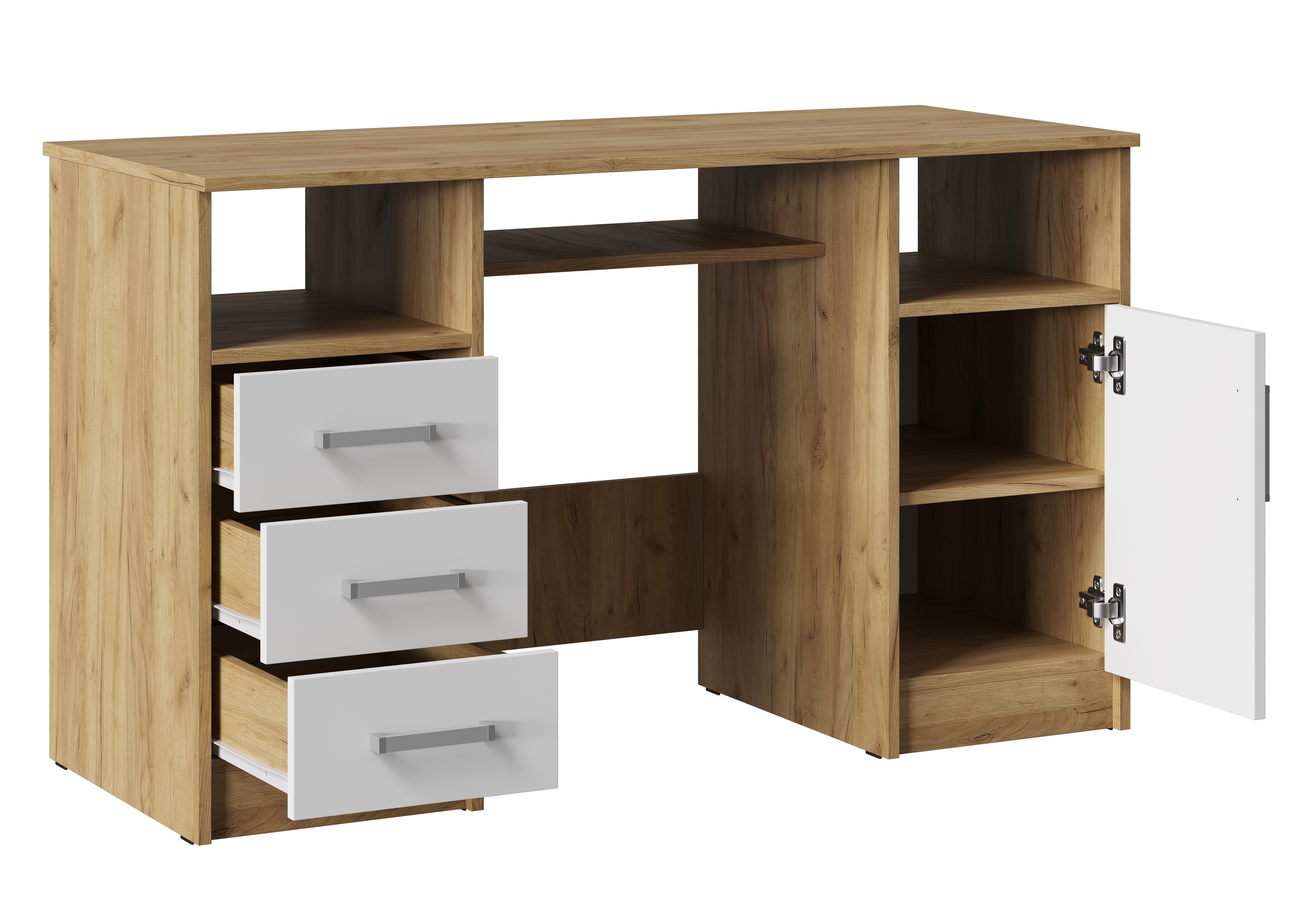Он состоит из двух тумб, расположенных по краям, и столешницы, обеспечивающей достаточно места для работы и учебы. Открытые ниши, расположенные под столешницей над каждой из тумб идеально подходят для хранения книг, документов или других необходимых вещей, которые всегда должны быть под рукой.