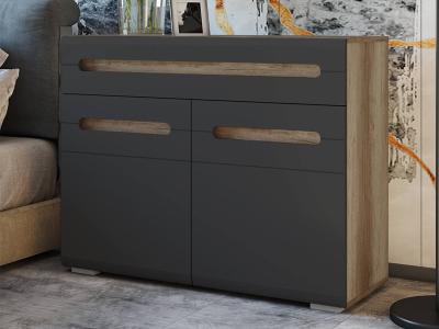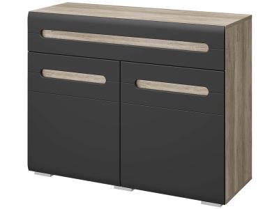 Неглубокая тумба "Наоми" может использоваться в любой комнате вашей квартиры или дома. Модель оснащена одним выдвижным ящиком и двумя распашными дверцами, за которыми находятся полки для хранения. Изделие имеет характерную для коллекции "Наоми" отделку: корпус выполнен из ЛДСП в цвете "дуб каньон", а темно-серые фасады имеют интегрированные ручки.